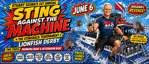 Join Stuart Scuba for the Sting Against the Machine: The Stingback Tournament, our annual lionfish derby dedicated to removing invasive lionfish from Florida reefs, having a blast on the water, and giving Benjamin a little well-earned revenge.